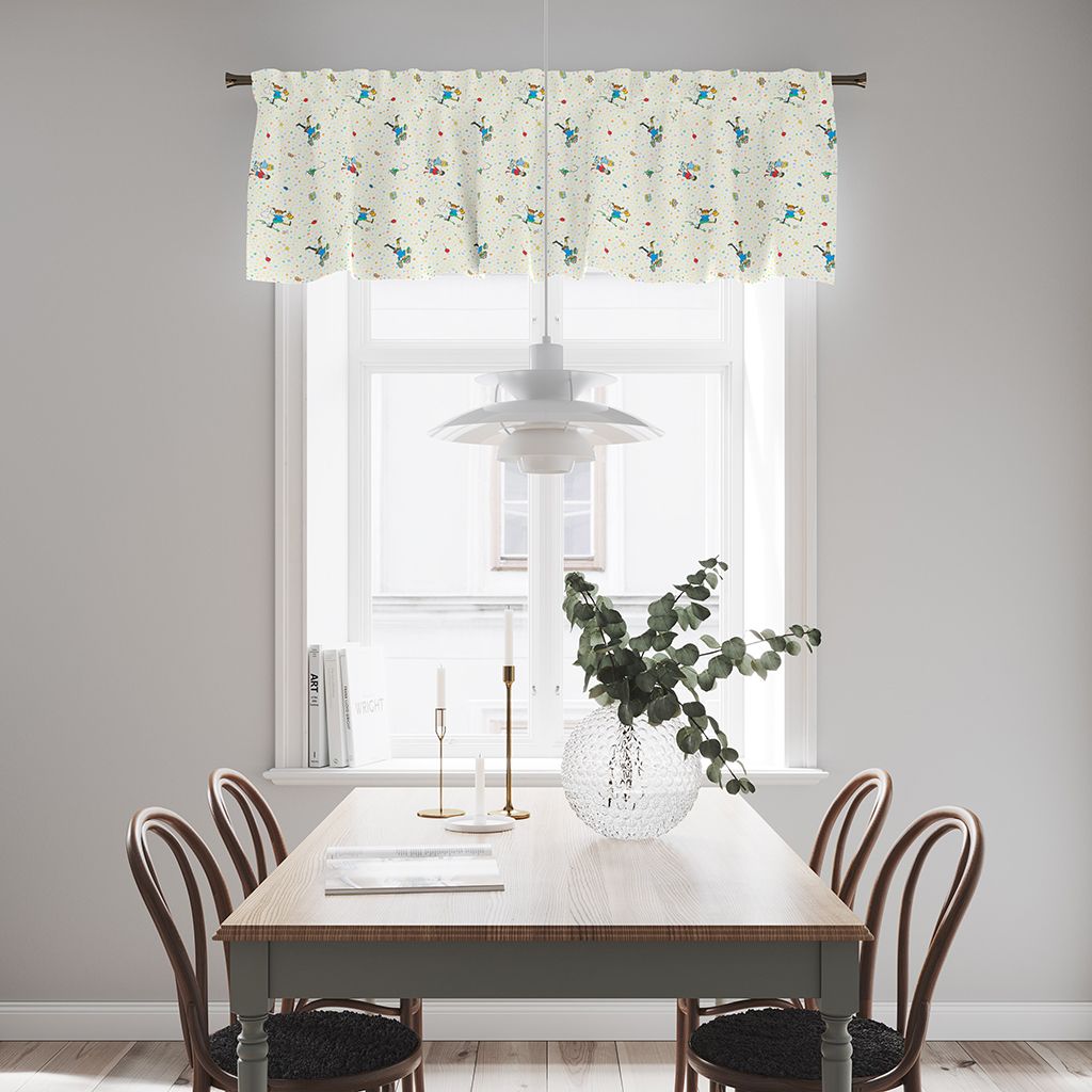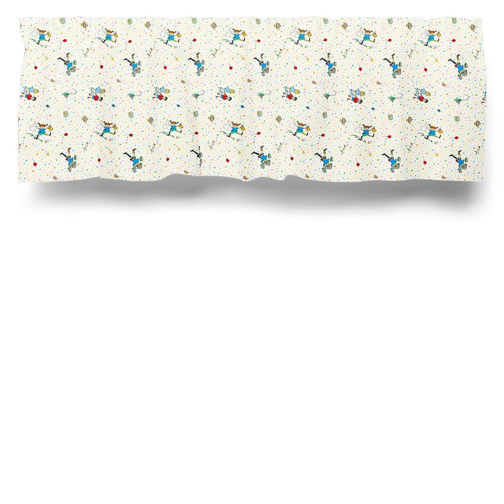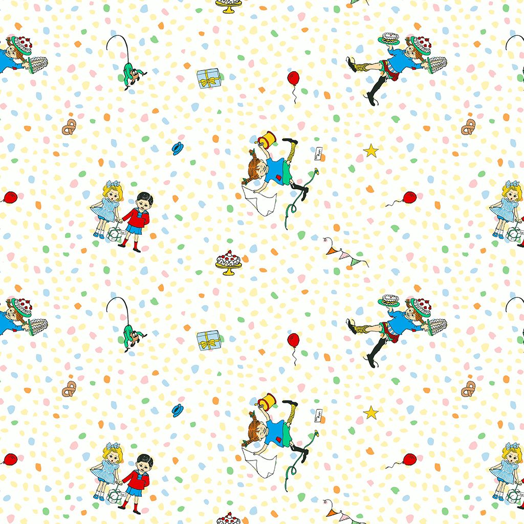Denna gardinkappa i metervara med motiv från Pippi Långstrump sprider glädje och energi i rummet. Mönstret visar Pippi, Tommy och Annika tillsammans med små detaljer som för tankarna till kalas och lek. Den ljusa botten med prickar gör att motivet framträder tydligt och skapar en livfull men ändå balanserad helhet.