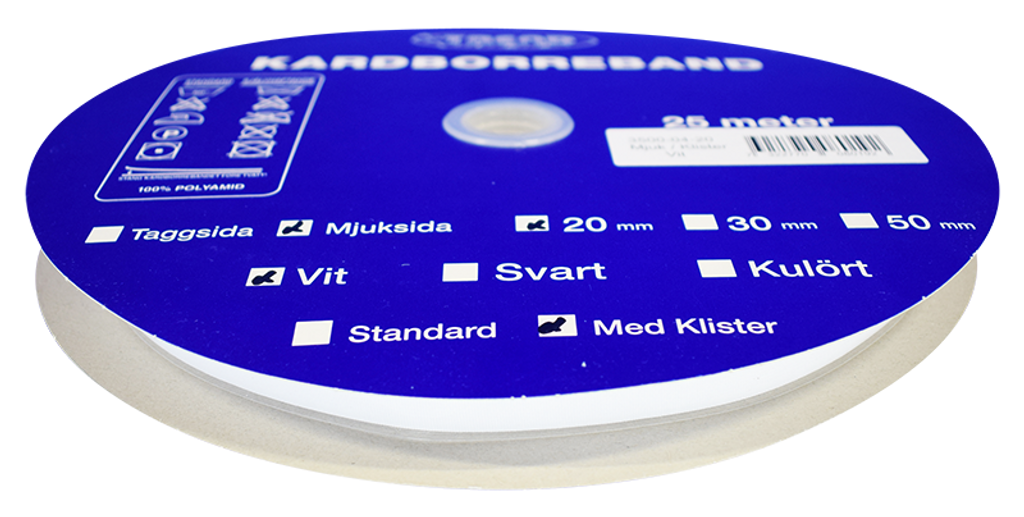 Beskrivning av Kardborreband mjuk klister vit 20mm - 25m rulle