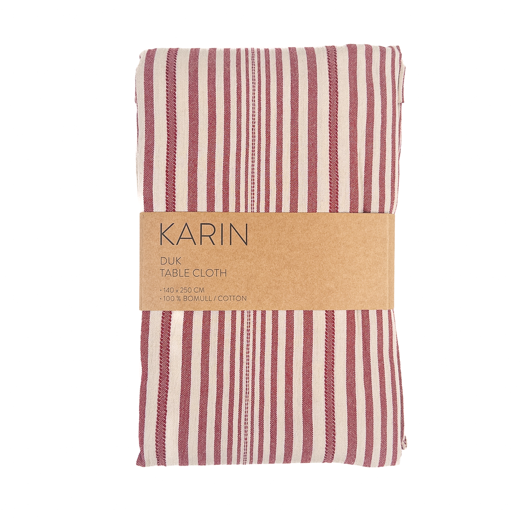Bordsduken Karin röd är en tidlös duk i 100 % bomull med ett garnvävt randmönster i vackert röd och linnefärgad ton. Färgkombinationen skapar ett lugnt och naturligt uttryck som passar lika bra i lantlig köksmiljö som i modern matsalsinredning. Den garnvävda strukturen ger mönstret liv och djup, samtidigt som den rustika känslan förstärker dukens genuina karaktär.