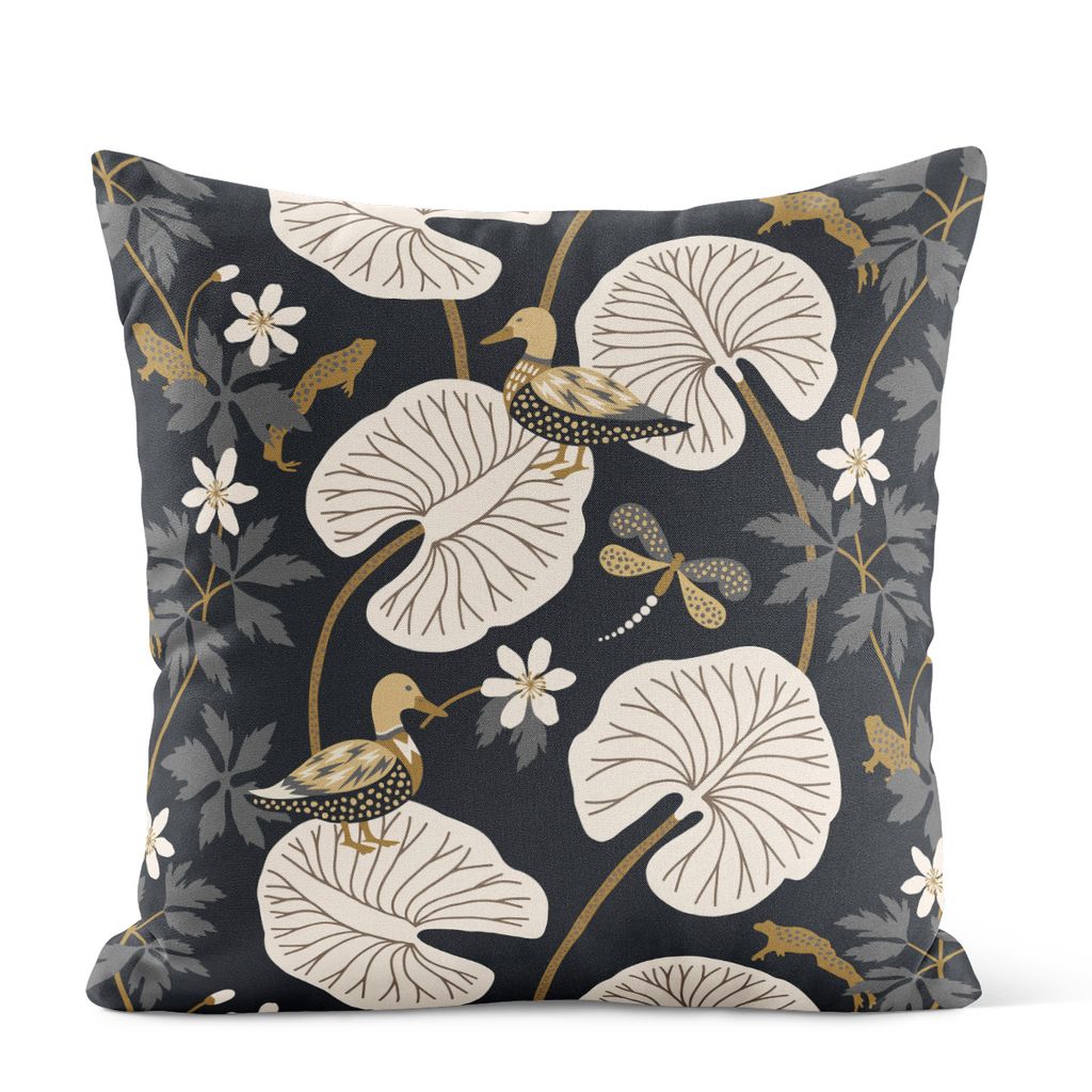 Ge ditt hem en naturinspirerad och harmonisk känsla med Kärrleken mörkblå kuddfodral. Mönstret med näckrosor och änder på en mörkblå botten skapar en lugn och elegant atmosfär.