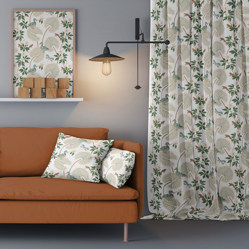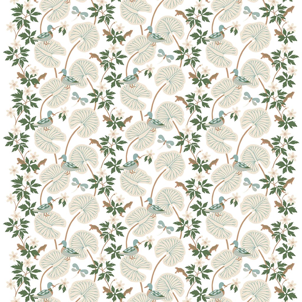 Ett härligt mönster av blommor, blad och djur. Mönstret är tryckt på Arvidssons klassiska bomullsvara. Passar lika bra i hemmet som på kontoret. Bilden visar mönstret på hela tygets bredd. Tillverkat i Spanien