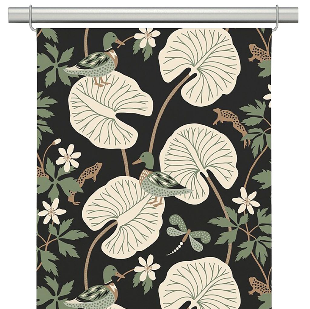 Kärrleken svart panelgardiner, med gräsänder, blommor och blad. Svart botten med mönster i grönt och beige.