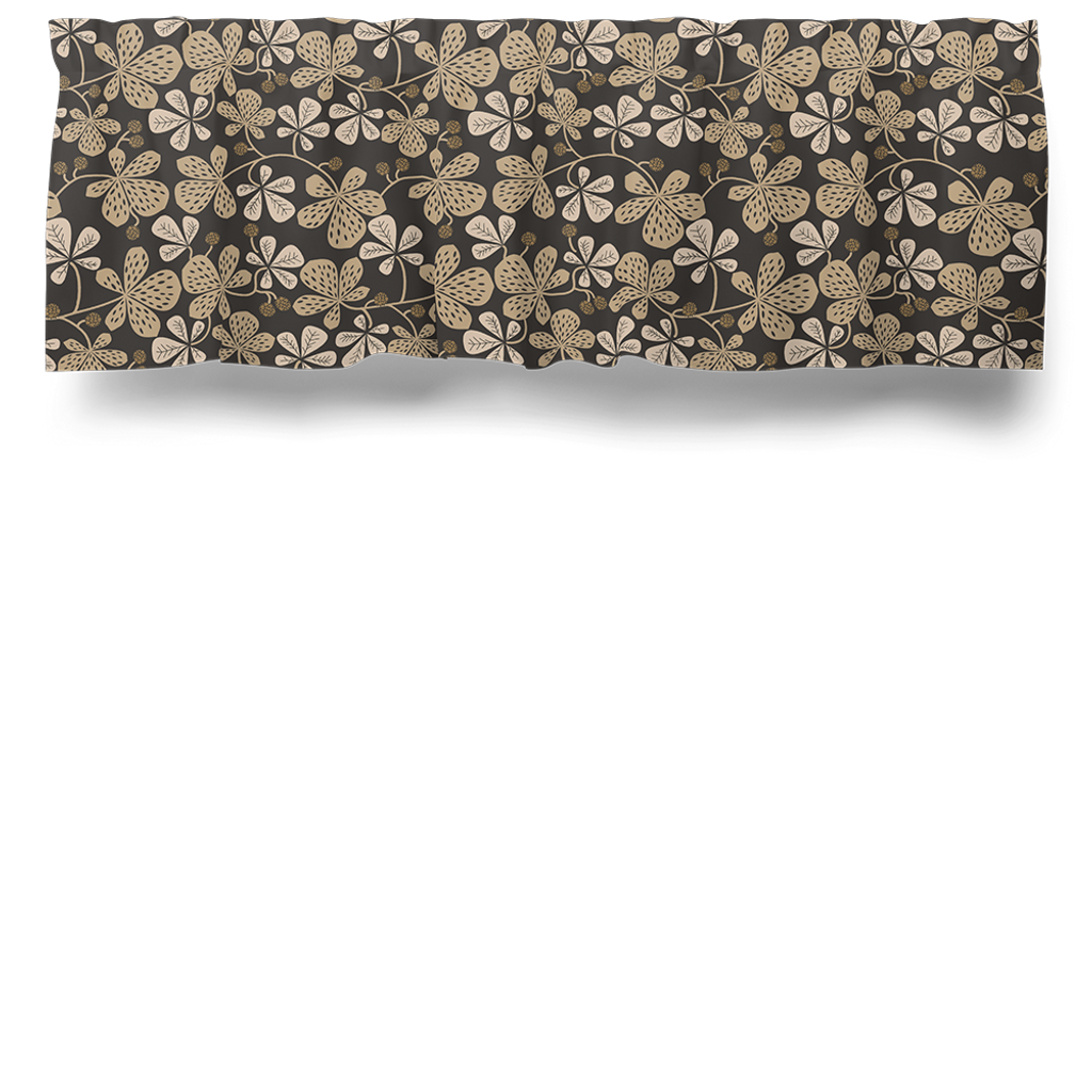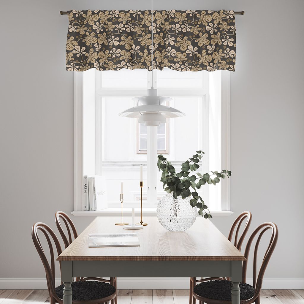 Gardinkappa på metervara med multiband och ofållade sidor. Tyget Kastanjer grå har ett livfullt mönster som fångar skönheten i kastanjeträdets bladverk. Kappan är 55cm hög.