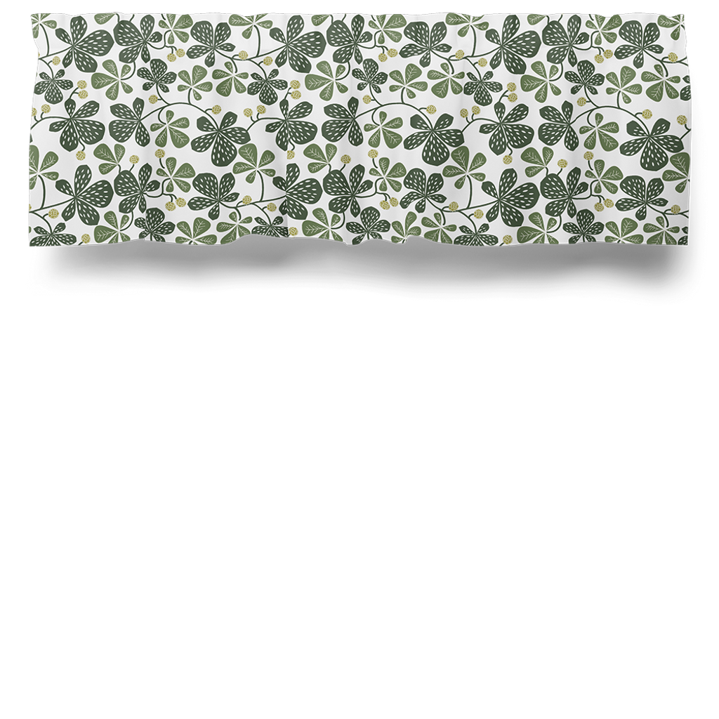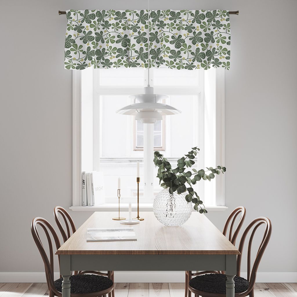 Gardinkappa på metervara med multiband och ofållade sidor. Tyget Kastanjer grön har ett livfullt mönster som fångar skönheten i kastanjeträdets bladverk. Kappan är 55cm hög.