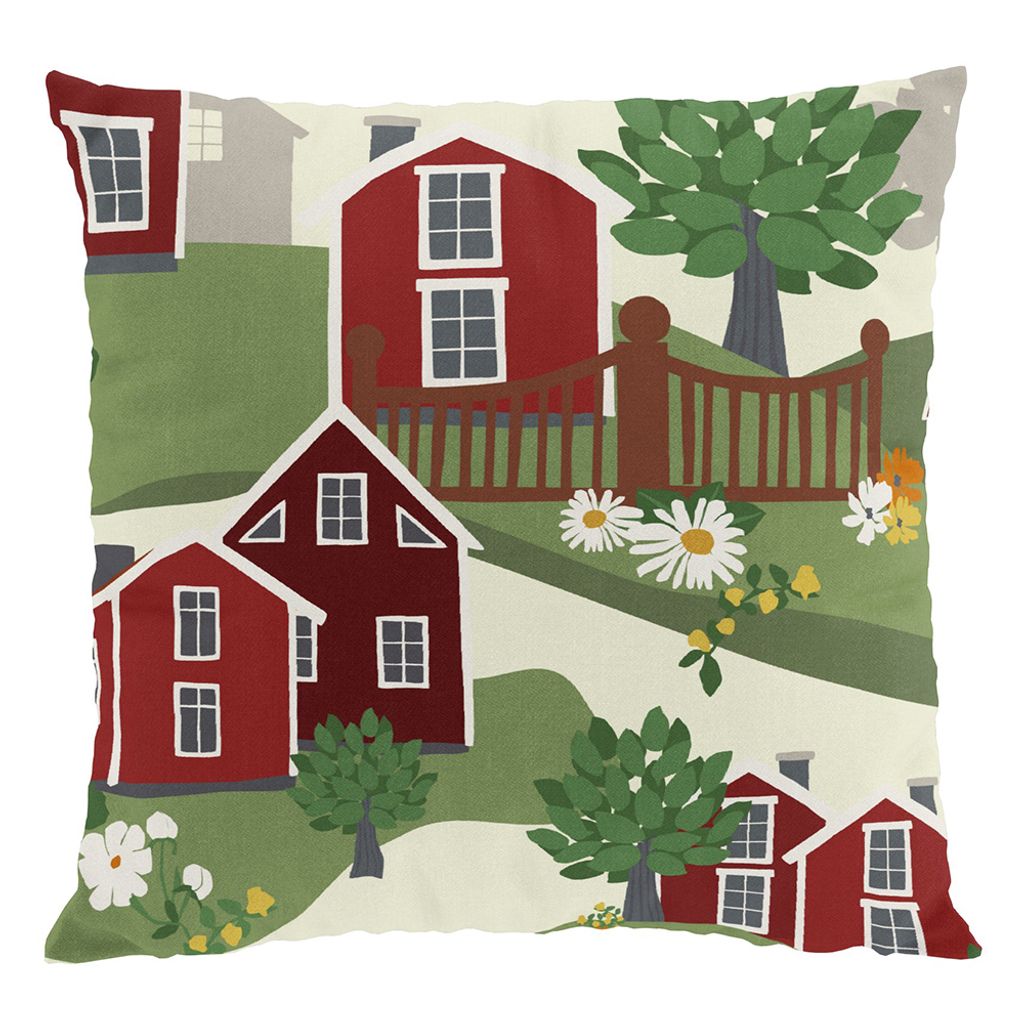 Katthult med röda hus och gröna buskar och träd. Fodralet är 47x47cm med ett blixtlås i nederkant.