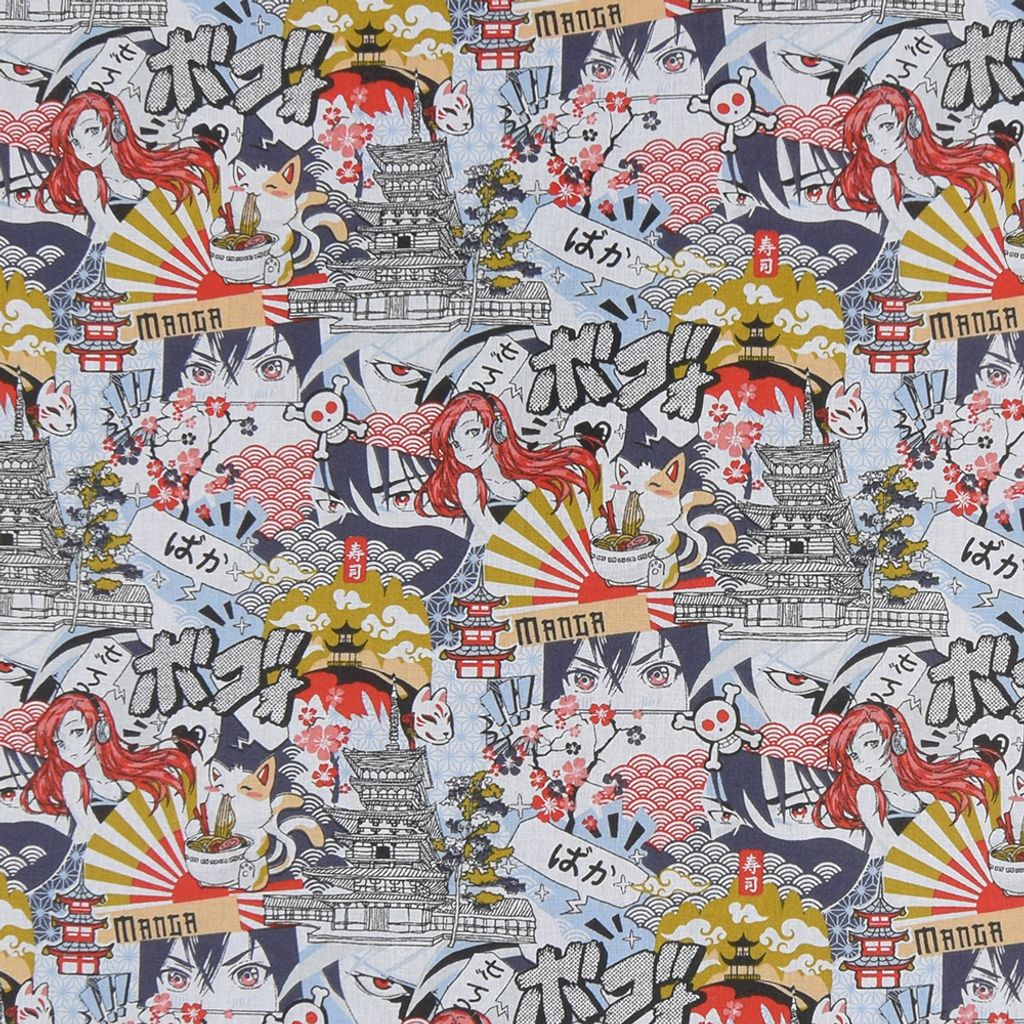 Bomullstyg med snyggt manga inspirerat mönster i rött, blått och gult.
