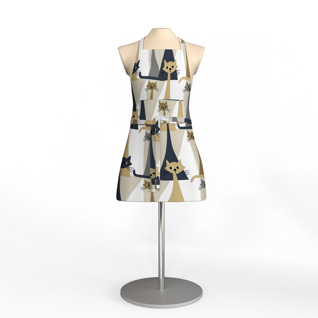 Ett förkläde med ett charmigt och retroinspirerat kattmönster i beige och grått. Perfekt för kattälskare och designentusiaster. En stor ficka fram och med reglerbara band.