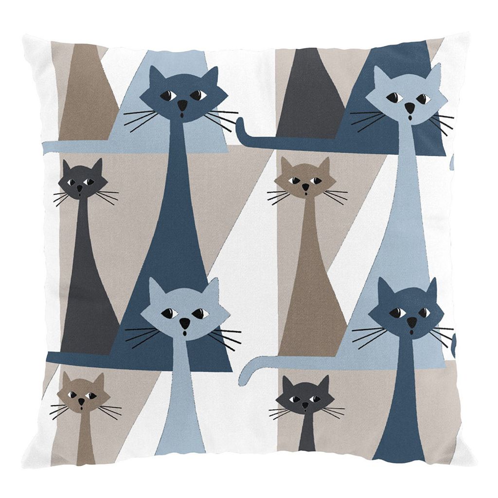 Kitty kuddfodral i färgerna blått och beige på offwhite botten. Fodralet är 47x47cm med ett blixtlås i nederkant.