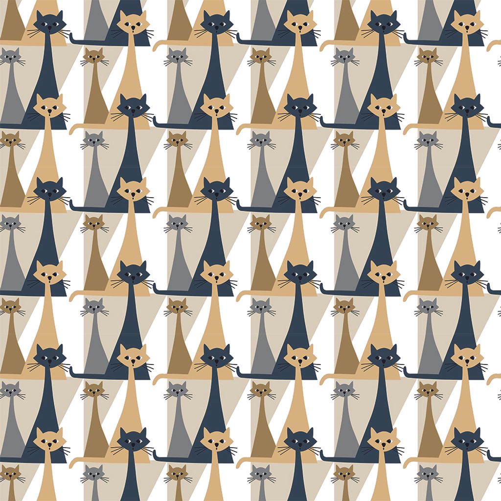 Katterna har långa, graciösa kroppar och uttrycksfulla ansikten som ger en unik karaktär till mönstret.