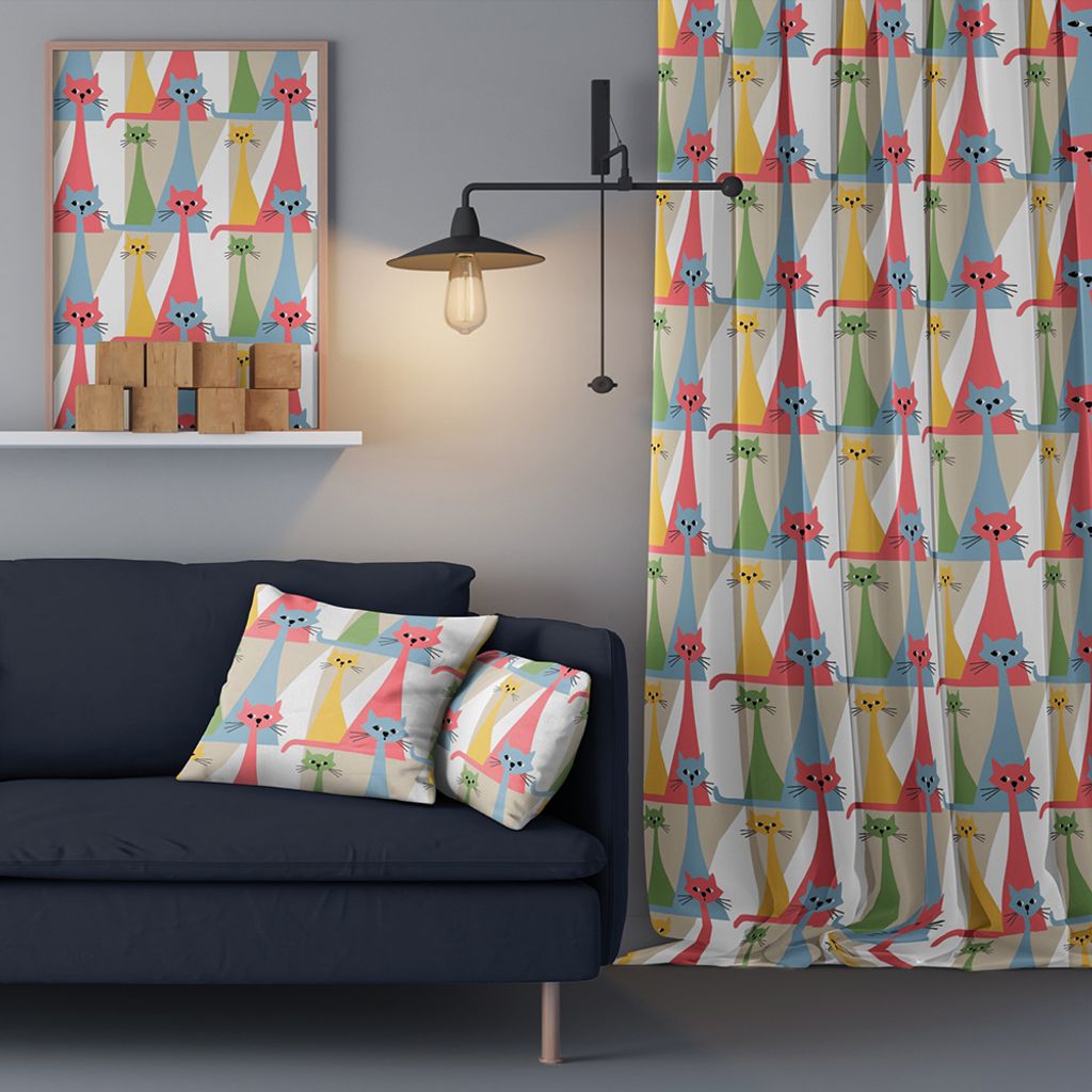 Katter i blått, grönt, rosa och gult på offwhite botten. Gardin och inredningstyg för hemmet och kontoret. Mönstret är tryckt på en fin bomullsvara