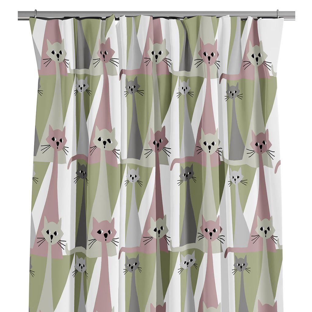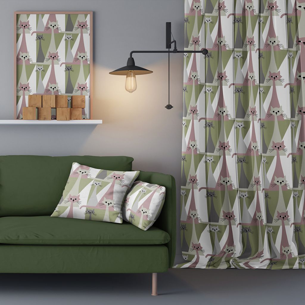 Retro gardiner med katter i rosa och grönt på offwhite botten