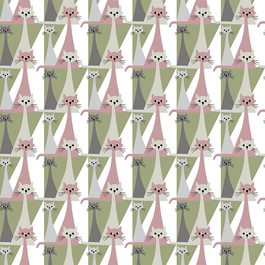 Katter i rosa och grönt på offwhite botten. Gardin och inredningstyg för hemmet och kontoret. Mönstret är tryckt på en fin bomullsvara