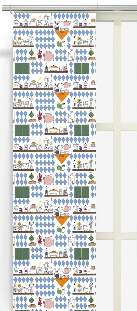 Köket blå panelgardiner kombinerar klassisk köksdesign med retrostil för att ge ditt kök ett unikt och charmigt utseende. Med detaljer som kaffekannor, mixers och andra köksföremål, samt ett dekorativt blått diamantmönster i bakgrunden, är dessa gardiner ett utmärkt val för dig som vill ge ditt kök både karaktär och stil. De är lätta att hänga upp och passar utmärkt för att skapa en trivsam och inspirerande köksmiljö.