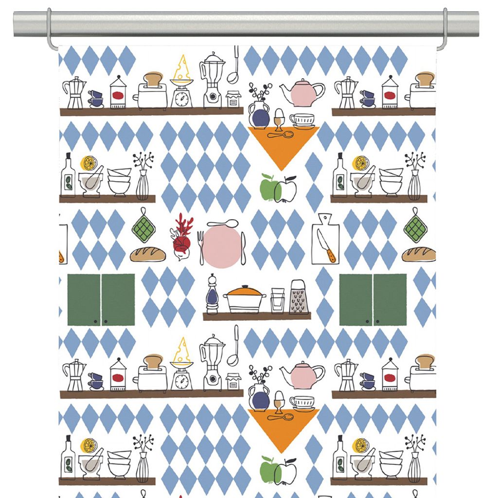 Ge köket en lekfull touch med Köket blå panelgardiner! Dessa gardiner har ett charmigt retromönster med köksdetaljer och ett blått diamantmönster som ger en fräsch och livfull atmosfär. Perfekt för dig som vill skapa en personlig och nostalgisk känsla i köket.