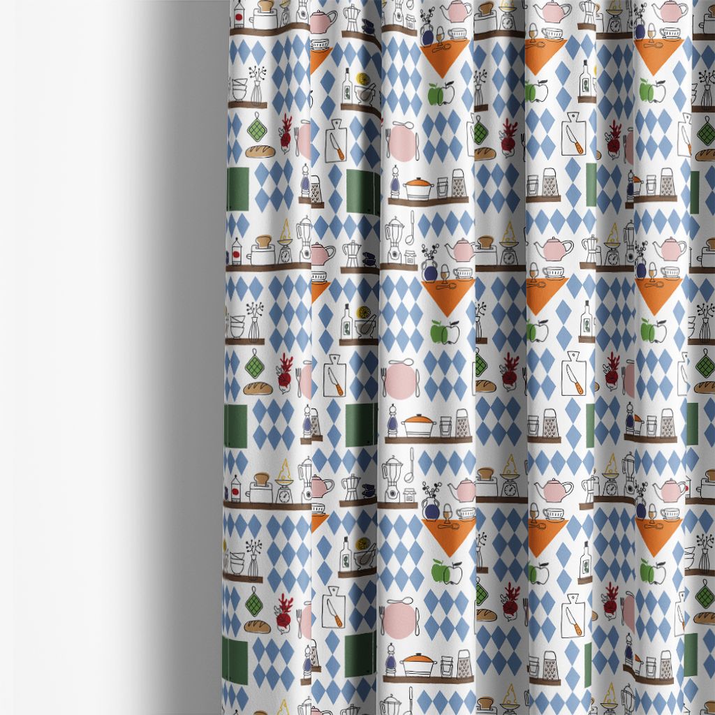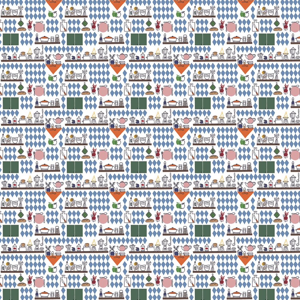Mönstret har en blandning av klassiska köksredskap, burkar, skålar och andra matlagningsdetaljer, arrangerade på hyllor mot en bakgrund av ljusblå diamantformer.