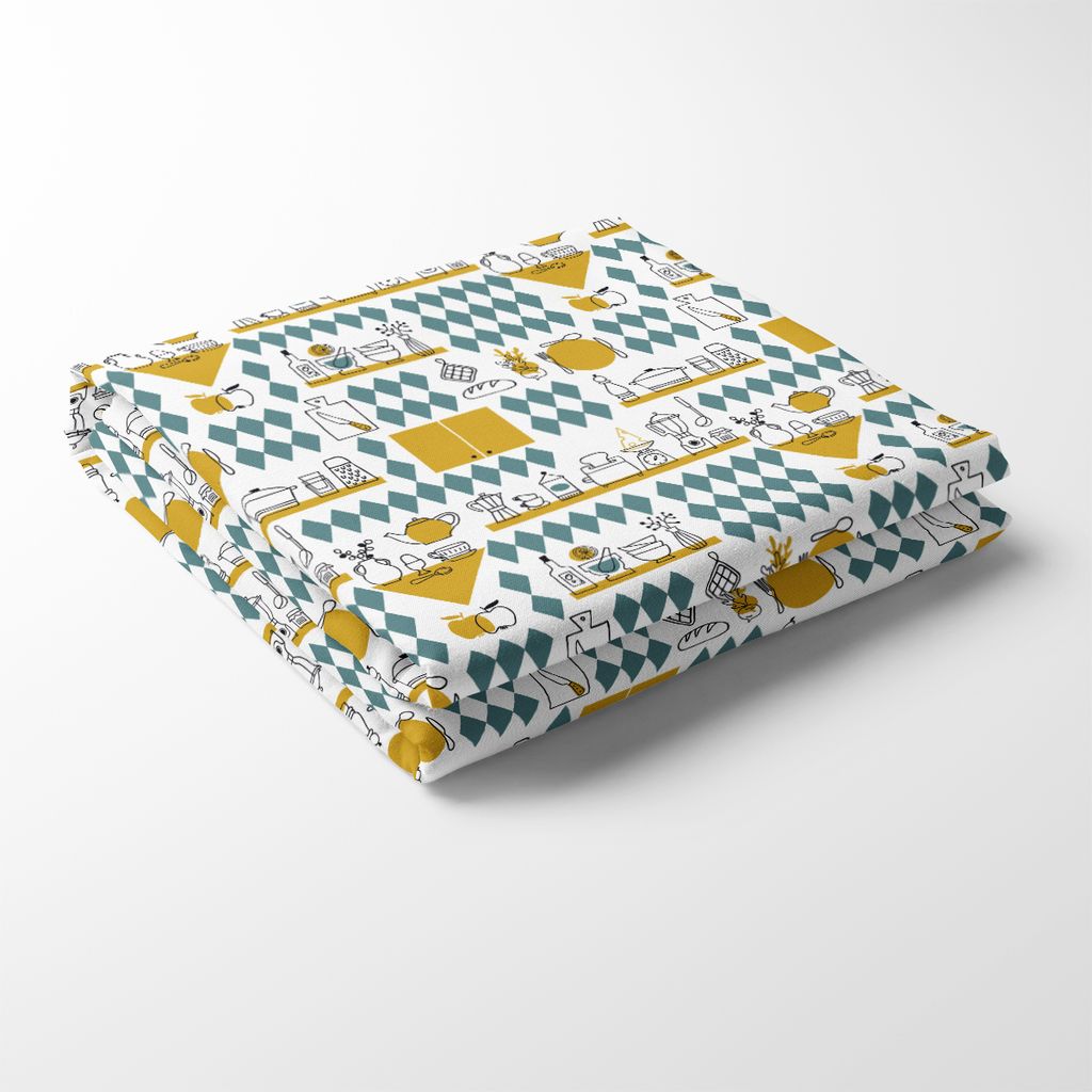 Bordsduk Köket gul har ett mönster av köksredskap, burkar, kryddor och andra köksdetaljer, arrangerade mot en bakgrund av grafiska diamantformer i petrol och gult.