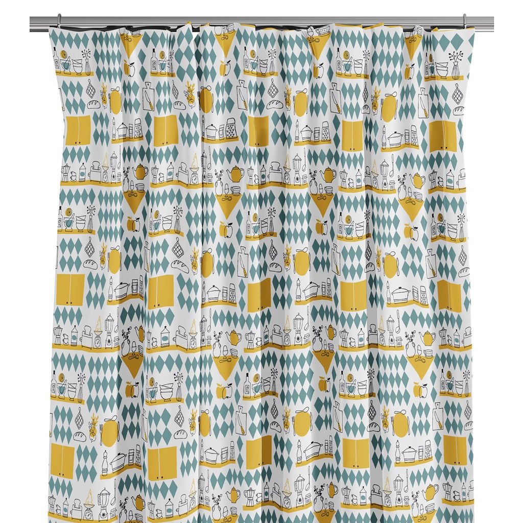 Gardinerna köket gul har färgstarka inslag som ger mönstret en modern twist, medan de svarta linjeteckningarna skapar en tydlig och stilren kontrast på den vita bakgrunden.