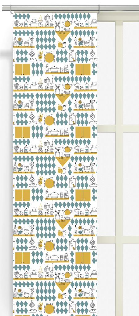 Liva upp köket med dessa Köket gul panelgardiner! Med ett lekfullt retromönster som inkluderar ikoniska köksdetaljer och ett diamantmönster i gula och blågröna nyanser, skapar de en härligt nostalgisk atmosfär. Perfekt för alla som vill addera charm och karaktär till sitt kök.