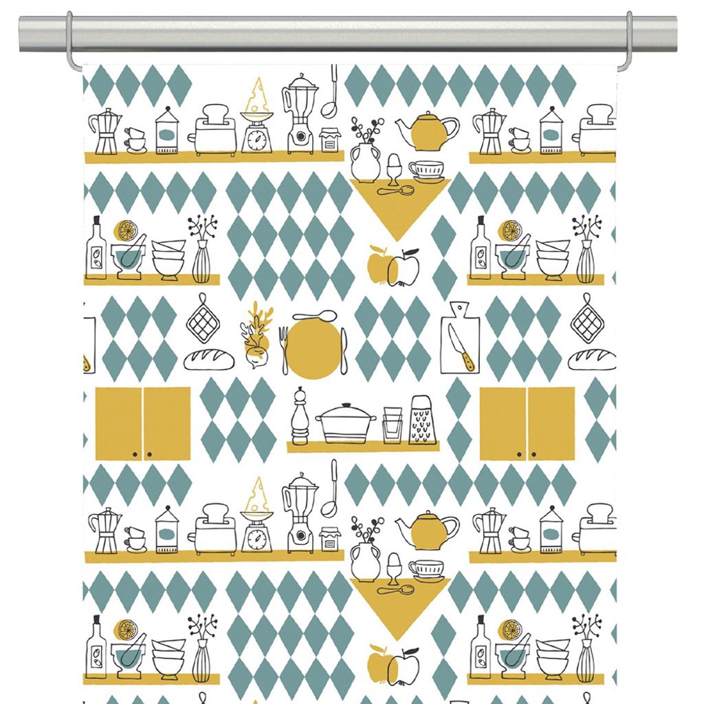 Köket gul panelgardiner är en hyllning till klassisk köksdesign och retrostil. Gardinerna är prydda med ett livfullt mönster av köksföremål – från vispar och mixers till kaffe- och tekannor – som ger en nostalgisk touch. Diamantmönstret i kontrasterande gul och blågrön bakgrund tillför ytterligare charm och får gardinerna att kännas både moderna och tidlösa. Enkla att hänga upp och perfekta för att ge ditt kök en inbjudande och personlig atmosfär.