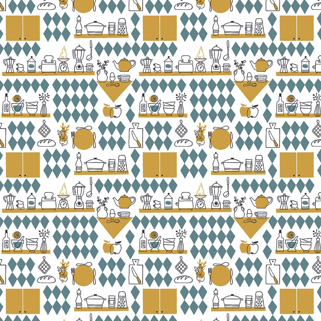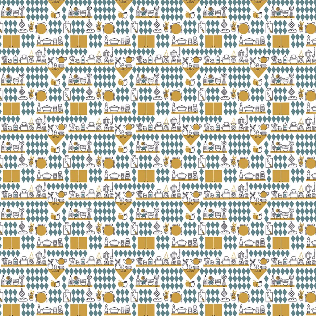 Köket ockra är ett lekfullt och retroinspirerat mönster som fångar charmen i ett klassiskt kök. Mönstret består av köksredskap, burkar, kryddor och andra köksdetaljer, arrangerade mot en bakgrund av grafiska diamantformer i grönt och gult.