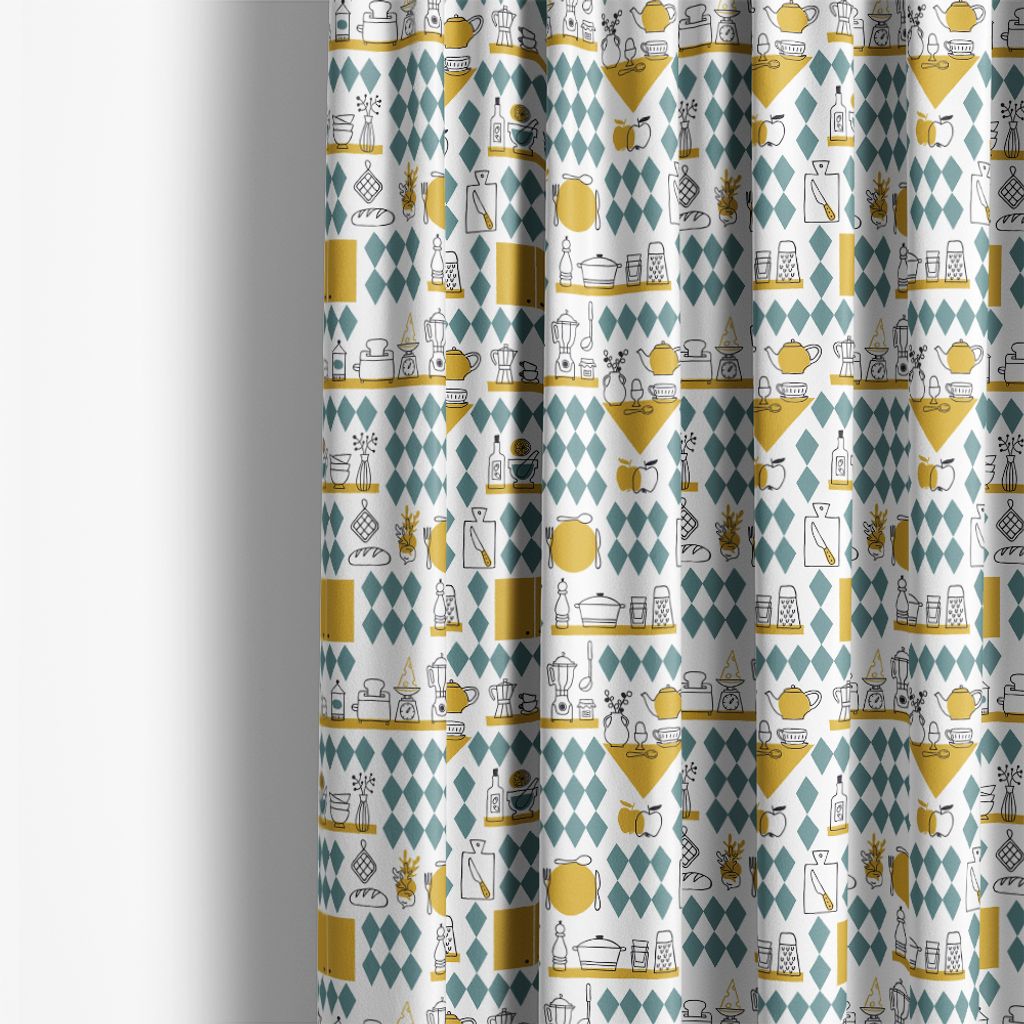 De illustrerade elementen i svart linje på den ljusa bakgrunden skapar en luftig och glad känsla, medan de färgade blocken tillför ett grafiskt djup. Köket ockra är perfekt för att tillföra en nostalgisk och hemtrevlig atmosfär i ditt kök eller matplats, och passar utmärkt för gardiner, kökshanddukar eller andra textilier som kan ge en färgstark och kreativ touch till rummet.