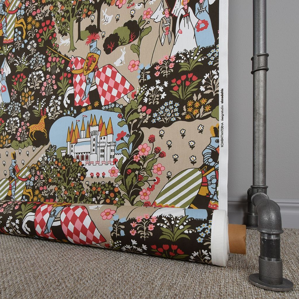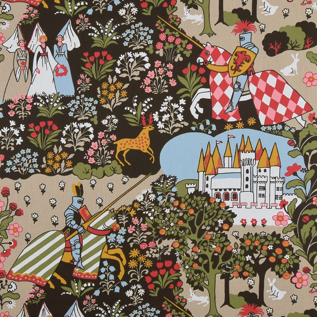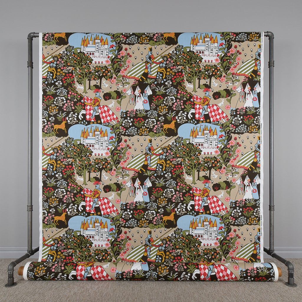 Bomullstyg med vackert motiv av blommor, slott, prinsessor, och riddare. Designer Ulla Bodin för Almedahls