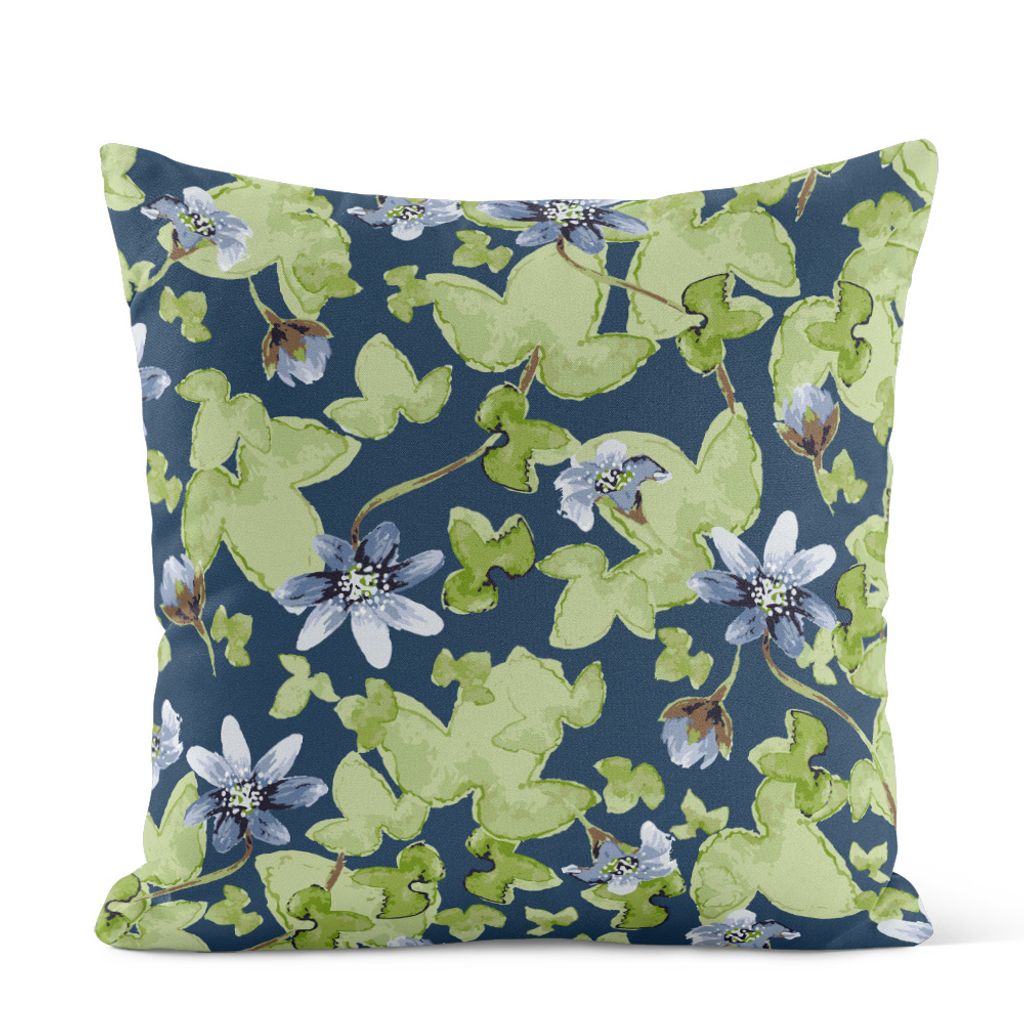 Ett Kuddfodral av tyget Blåsippa, Arvidssons klassiska bomullsvara. Produkten är stolt tillverkad i Estland.