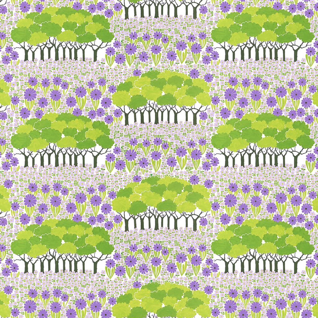 Vaxduk i bomull med akrylbeläggning med mönstret Allé i lila och grönt.