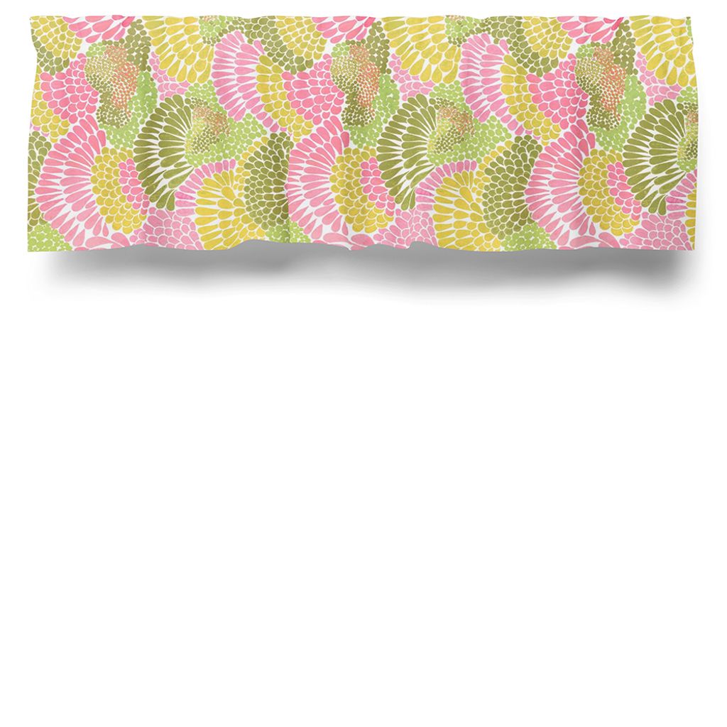 Retro gardinkappa i rosa med ett mönster av koraller i rosa, grönt och gult.