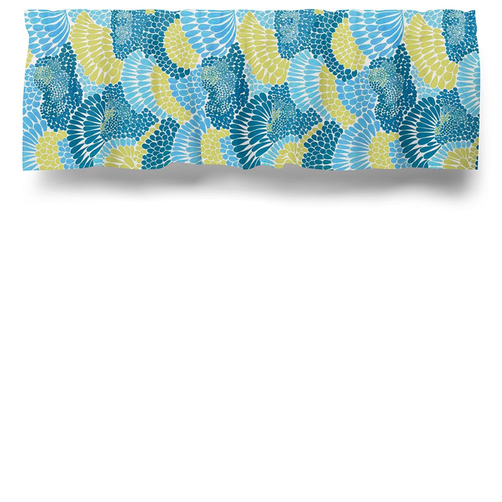 Gardinkappa på metervara med multiband och ofållade sidor. En gardinkappa med mönstret Korall turkos ifrån Arvidssons textil.