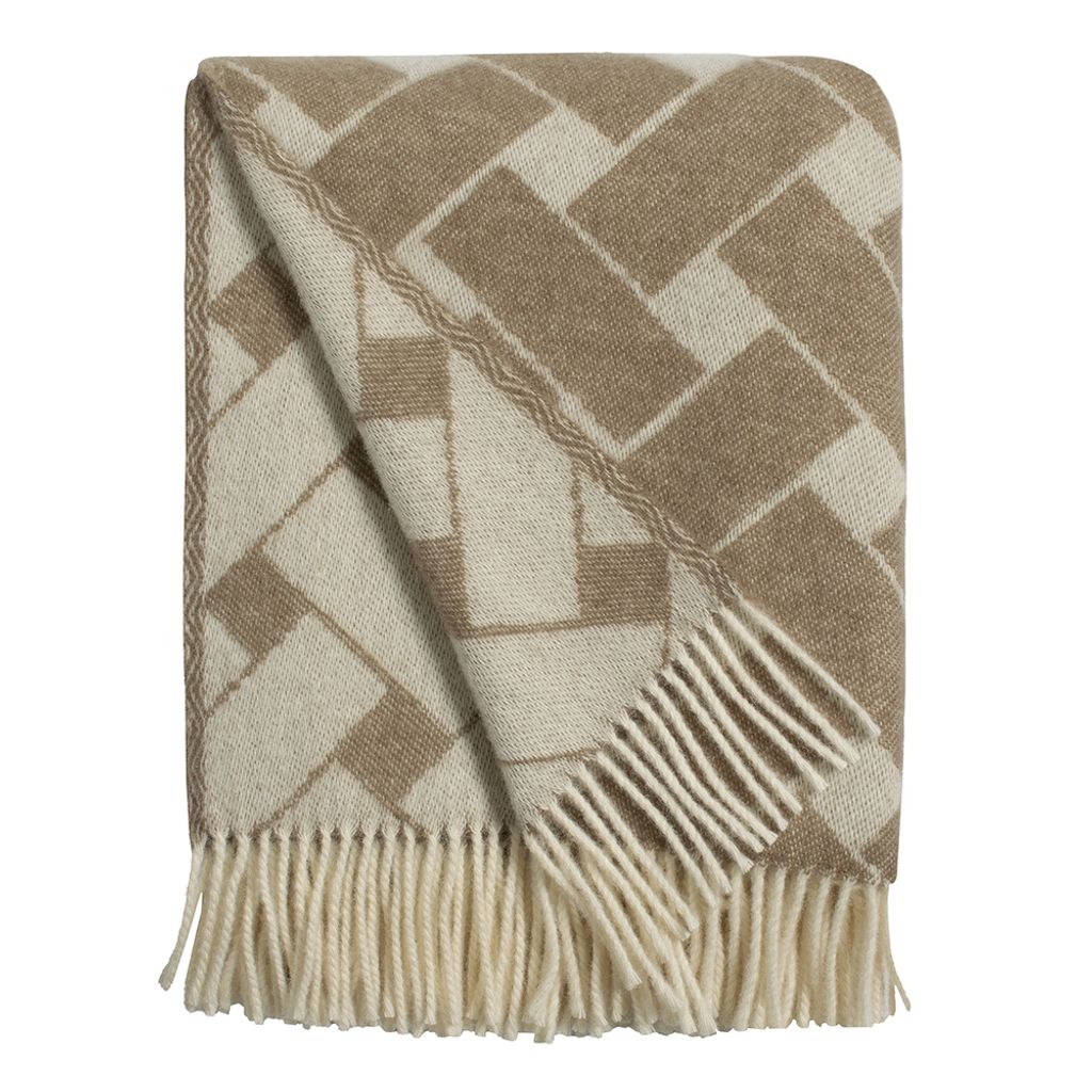 Stilren och mjuk ullfilt med ett elegant grafiskt mönster i brun och offwhite, tillverkad av 100% ull, vilket gör den både varm och hållbar.