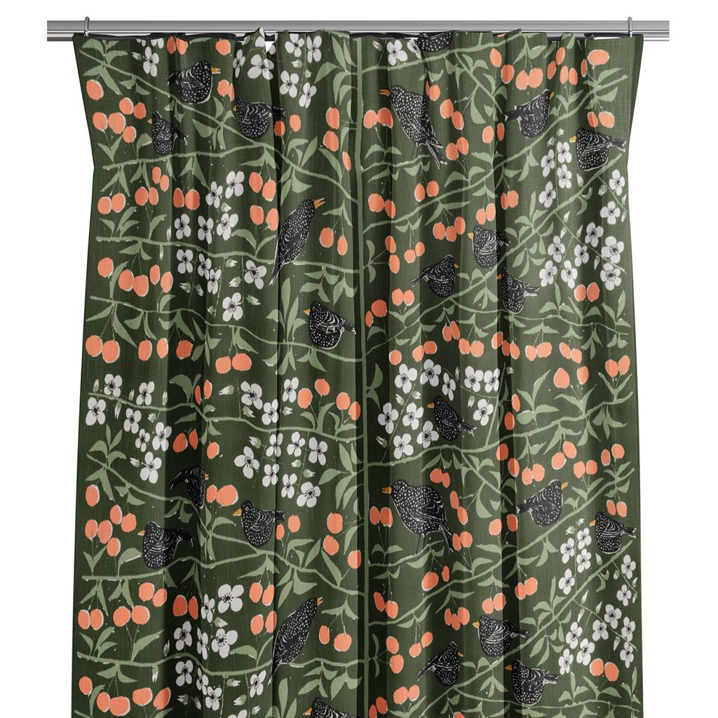 Körsbärsträdgården grön gardiner, designade av Marianne Westman, är ett tidlöst och vackert inslag i hemmet. Mönstret med fåglar, körsbär och blommor på en djupgrön botten skapar en harmonisk känsla och gör gardinerna till ett konstverk i sig. Finns i måtten 250cm och 315cm långa.