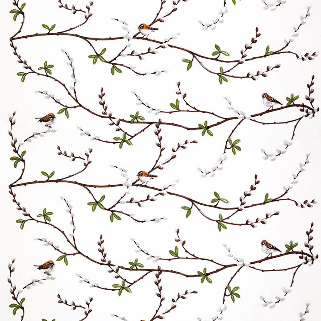 Bomullstyg med kvistar, videkissar och fåglar
