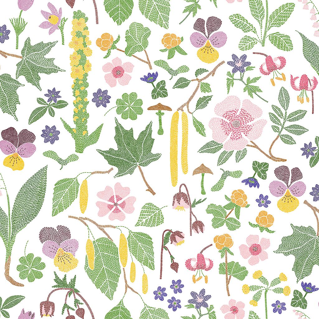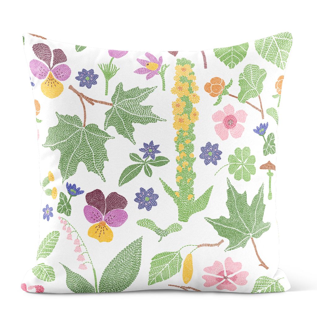 Kungsljus multi kuddfodral bjuder på ett rikt och detaljrikt mönster inspirerat av nordisk flora. Här möts olika blommor, blad och växter i en harmonisk färgpalett med inslag av grönt, rosa, lila, gult och blått. Mot den ljusa botten framträder varje motiv tydligt och ger ett livfullt men balanserat uttryck.