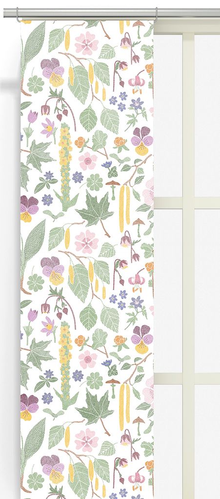 Kungsljus panelgardiner pryds av ett rikt blomstermönster inspirerat av nordisk flora. Mönstret består av blommor, blad och växtdelar i dämpade nyanser av grönt, rosa, gult och lila, placerade mot en ljus botten som ger ett luftigt helhetsintryck.