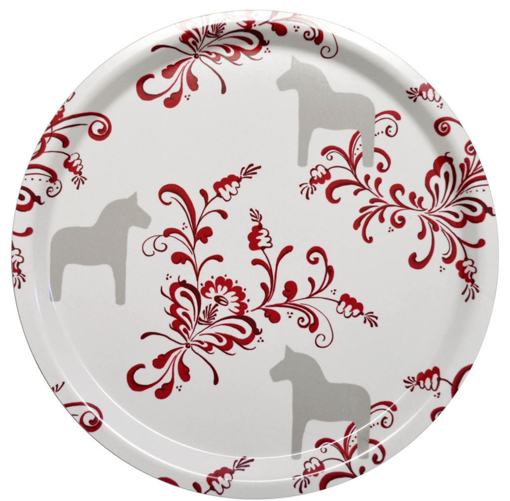 Kurbits beige-röd rund bricka med dalahästar