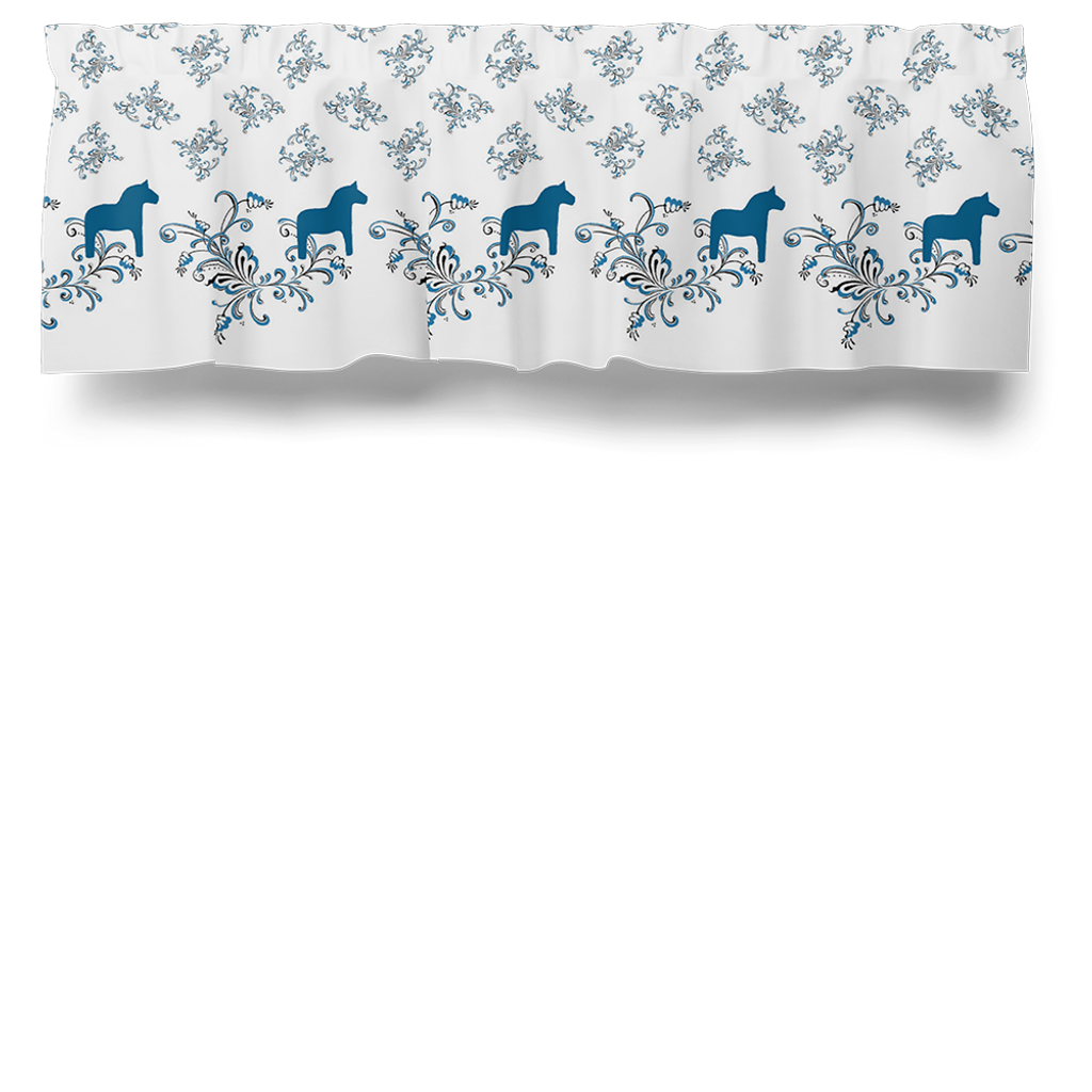 Gardinkappa med vit botten och dalahästar och kurbits i blått och grått.