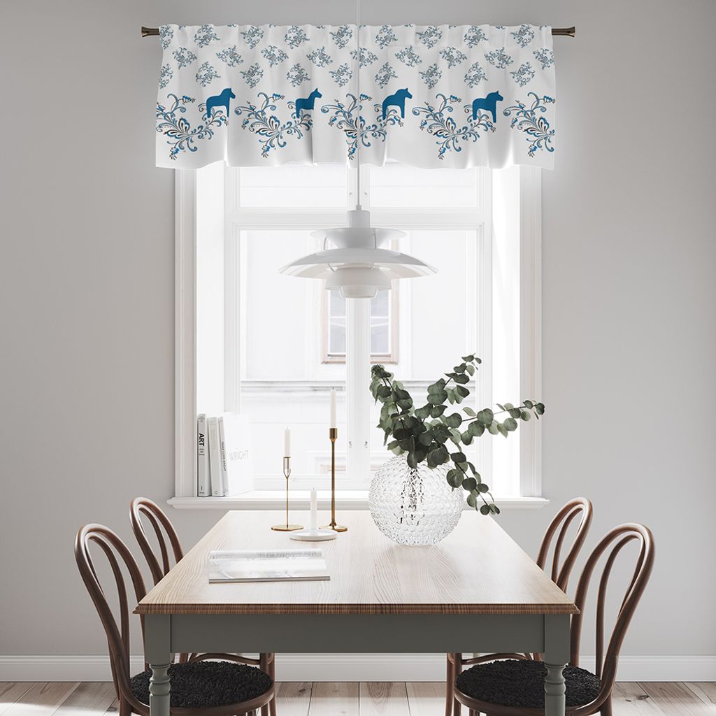 Beskrivning av Kurbits blå gardinkappa med dalahästar metervara