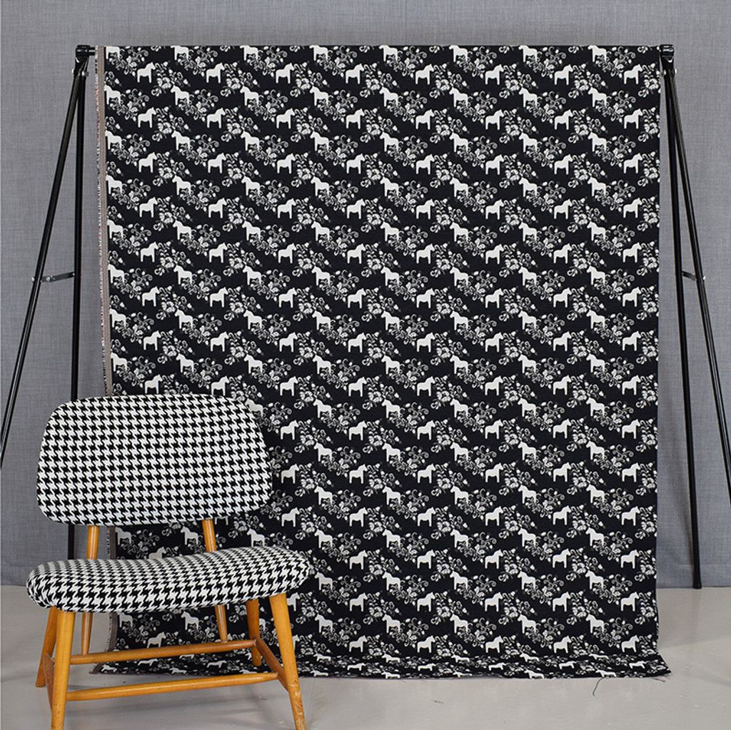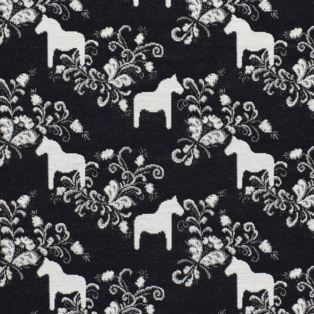Kurbits mini svart-grå jacquardtyg med dalahästar