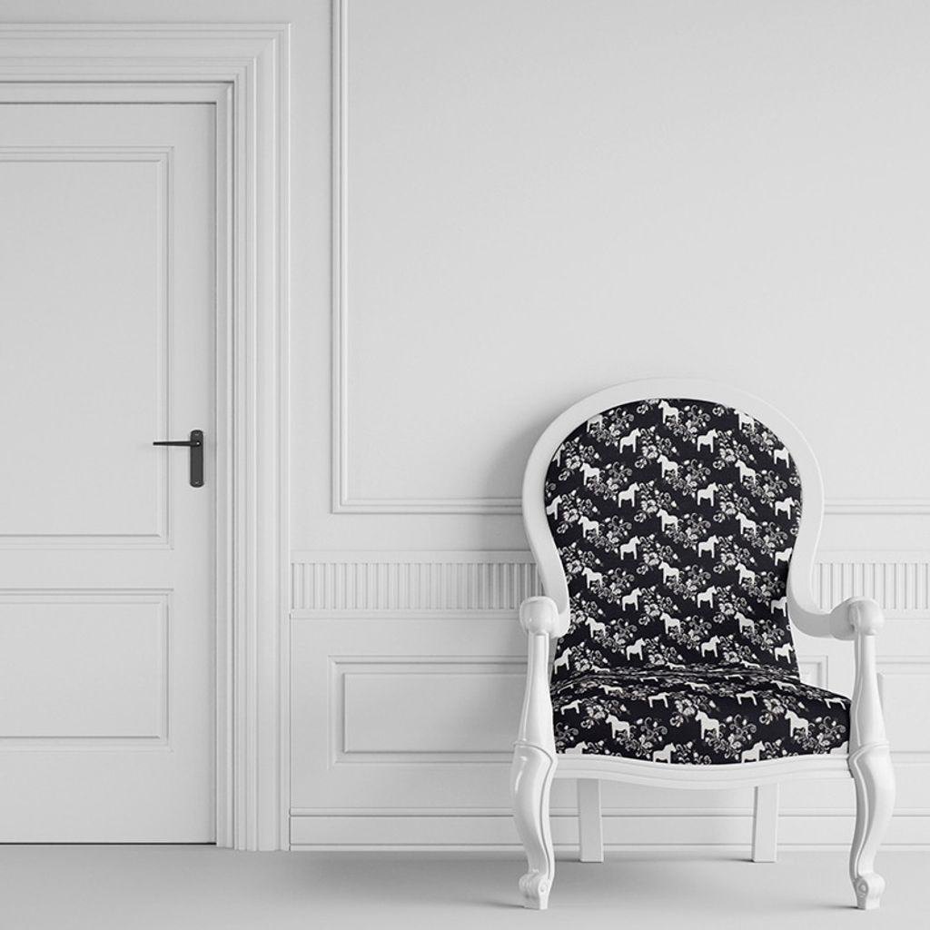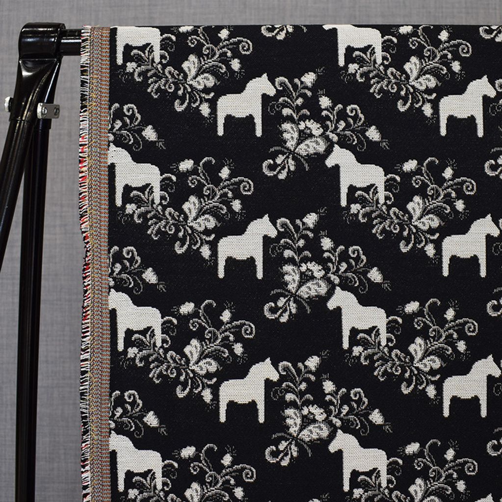 Ett gobeläng möbeltyg med svart botten och dalahästar.