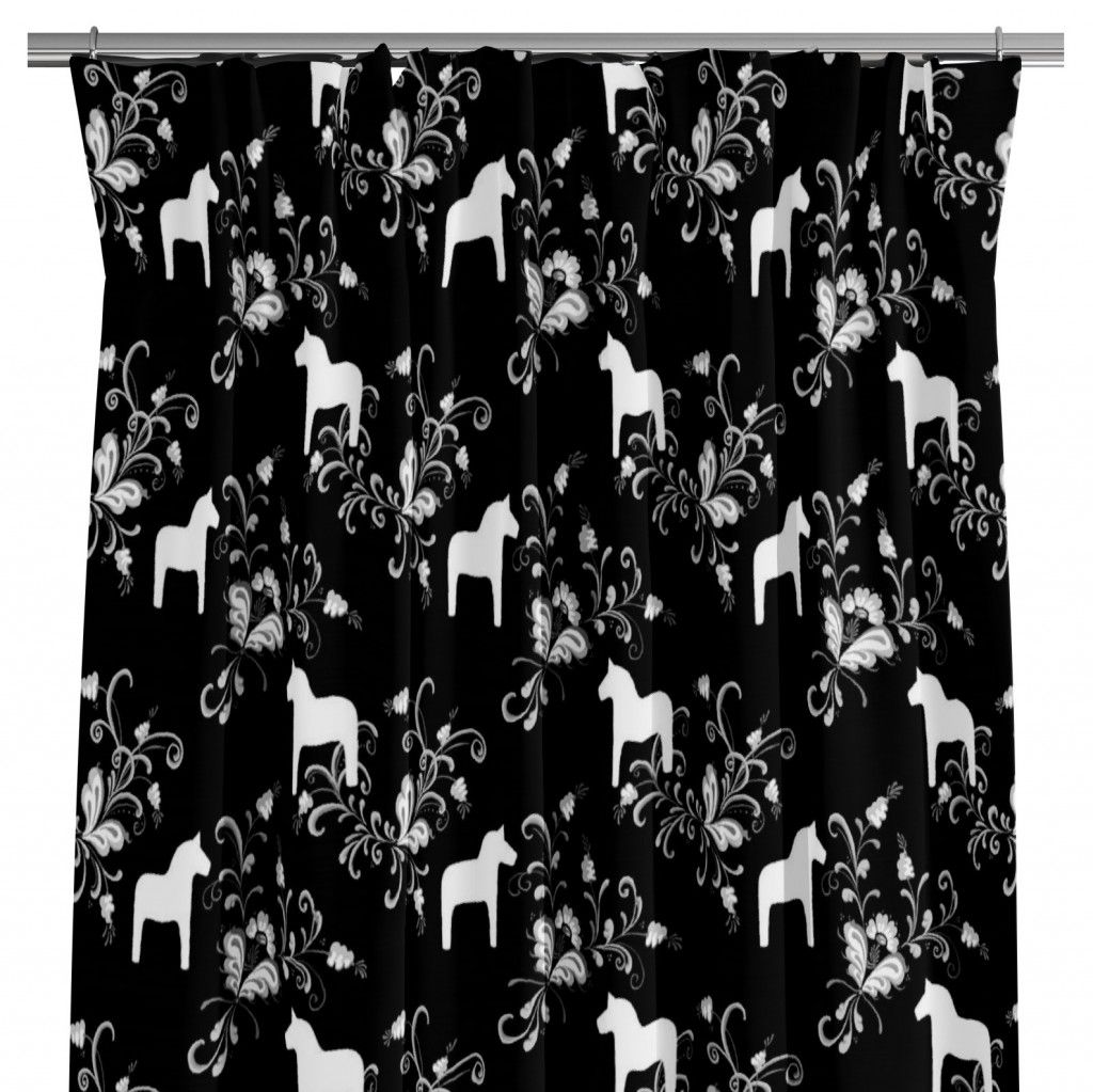 Beskrivning av Kurbits svart-grå gardiner med dalahästar