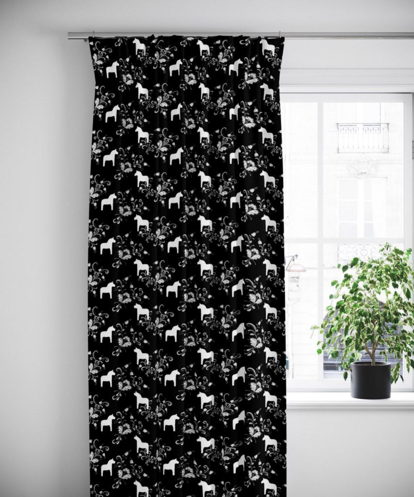 Kurbits svart-grå gardiner med dalahästar