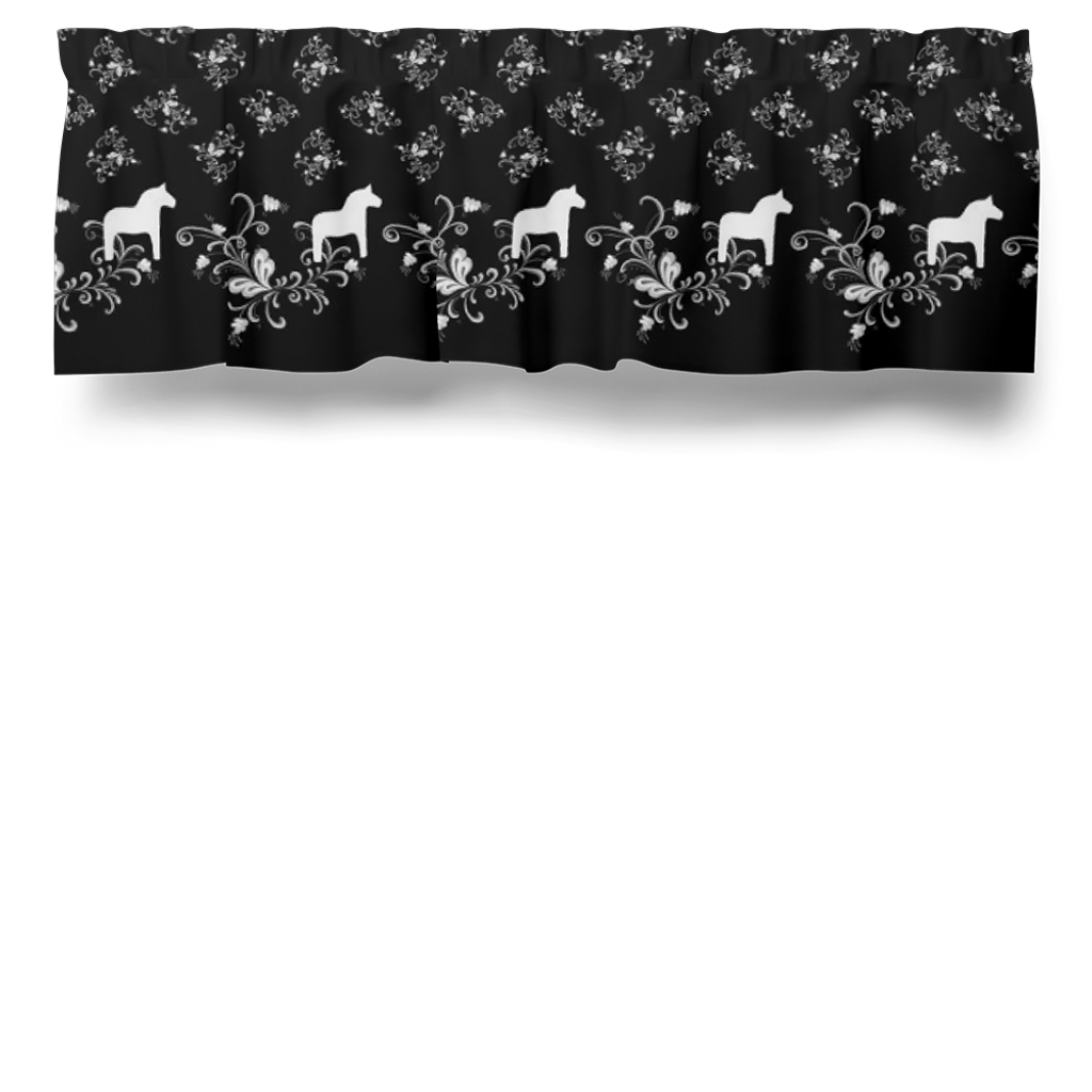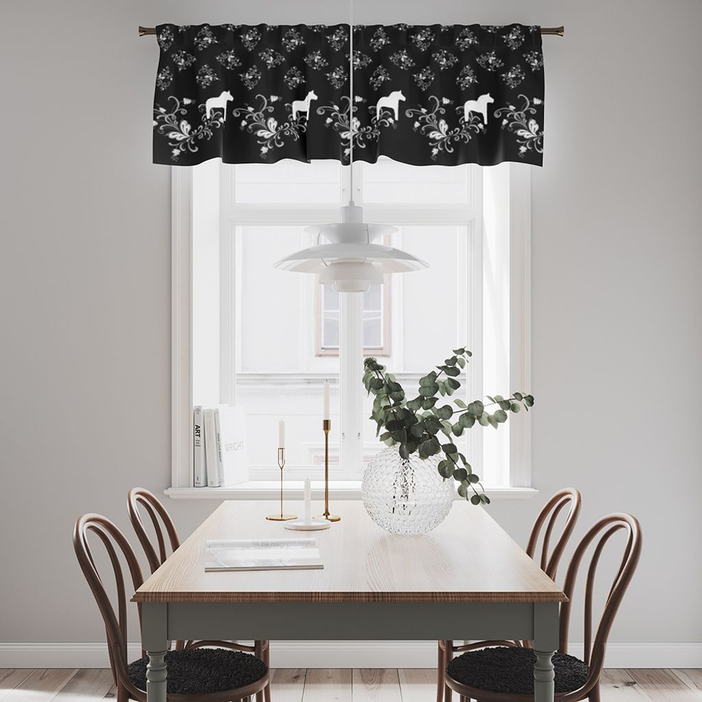 Svart gardinkappa med dalahästar och kurbits i grått.