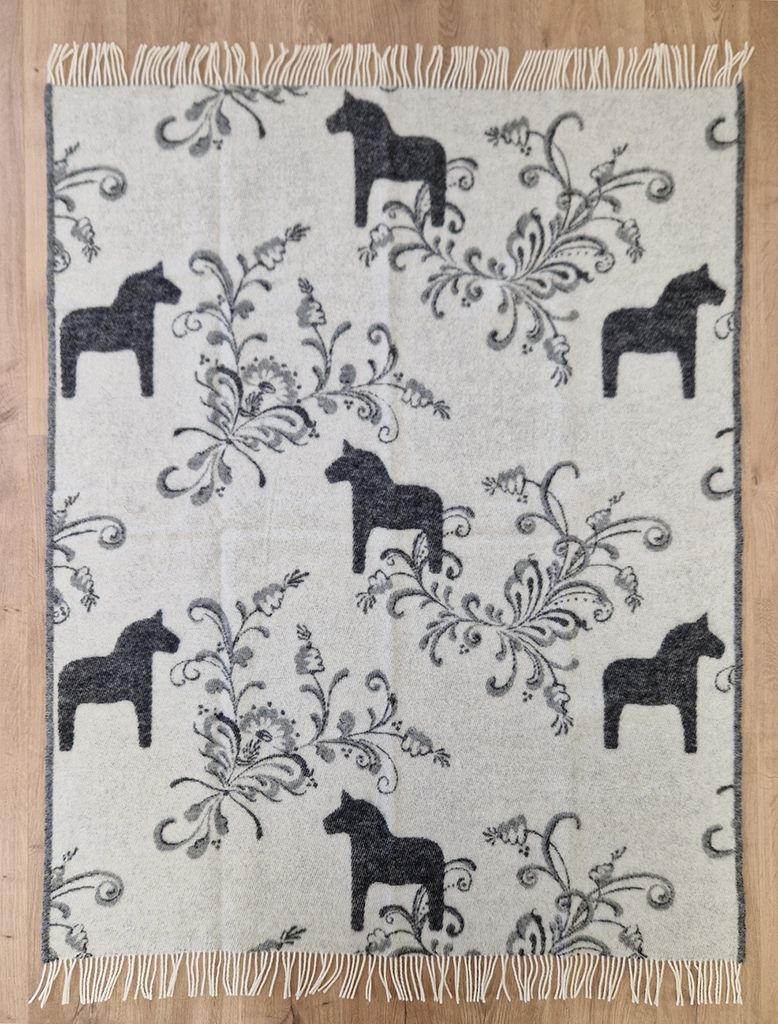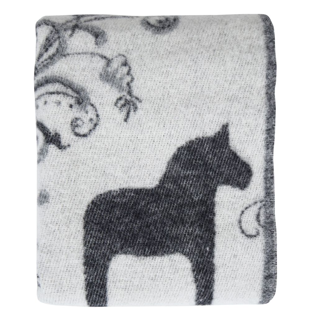 En super mysig pläd med mönstret kurbits och dalahästar, grå och offwhite.