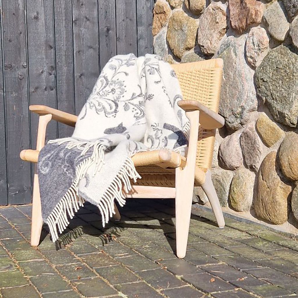 Grå och offwhite pläd med det vackra och populära mönstret kurbits i 100% ull.
