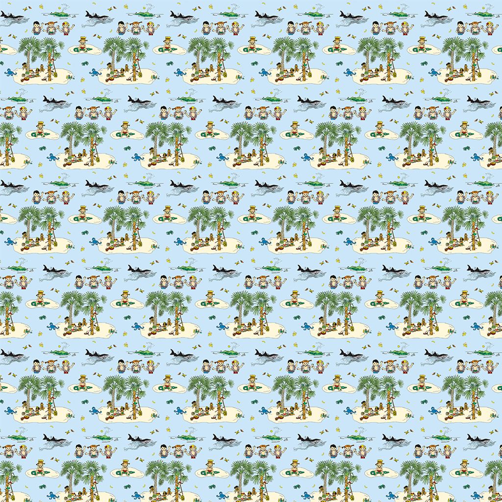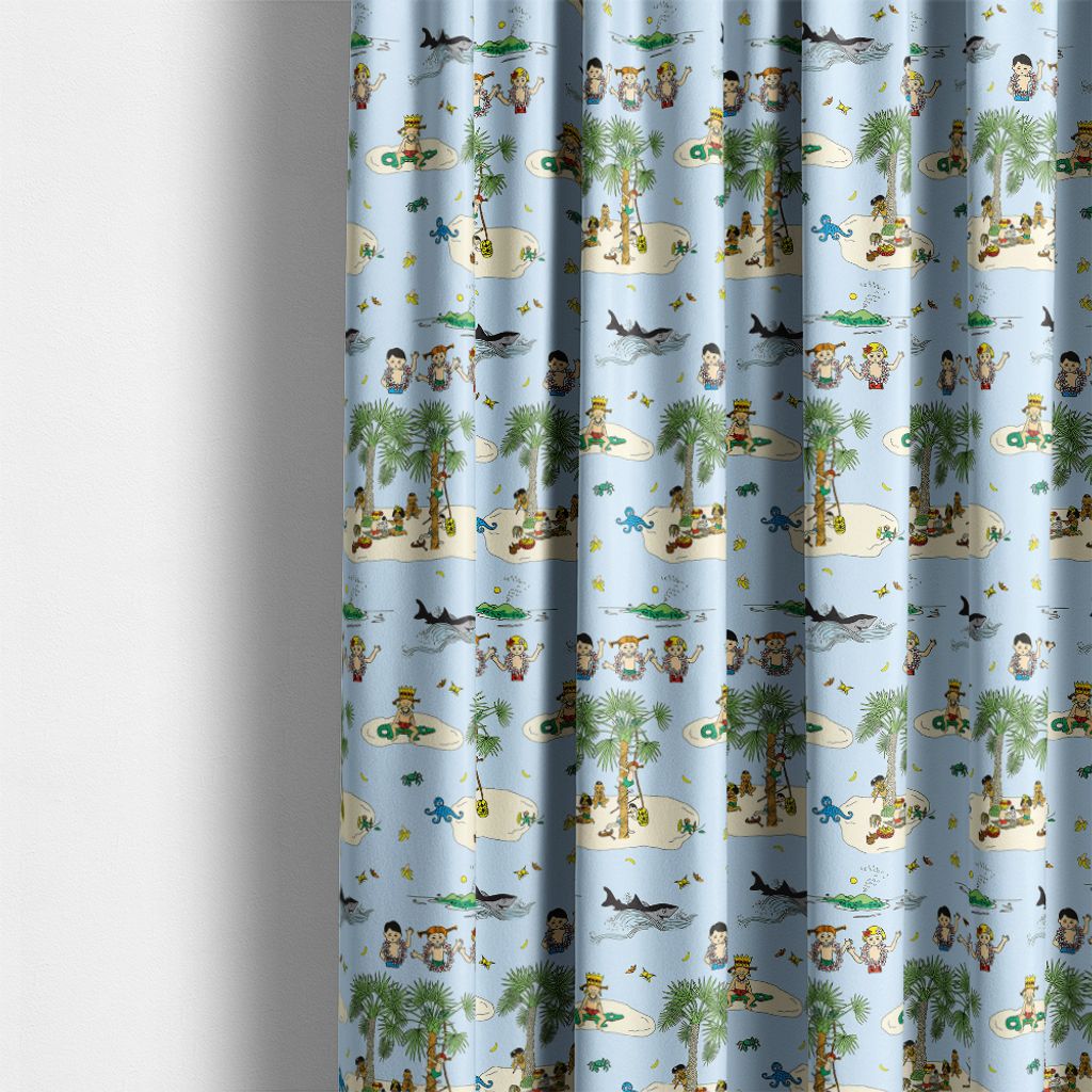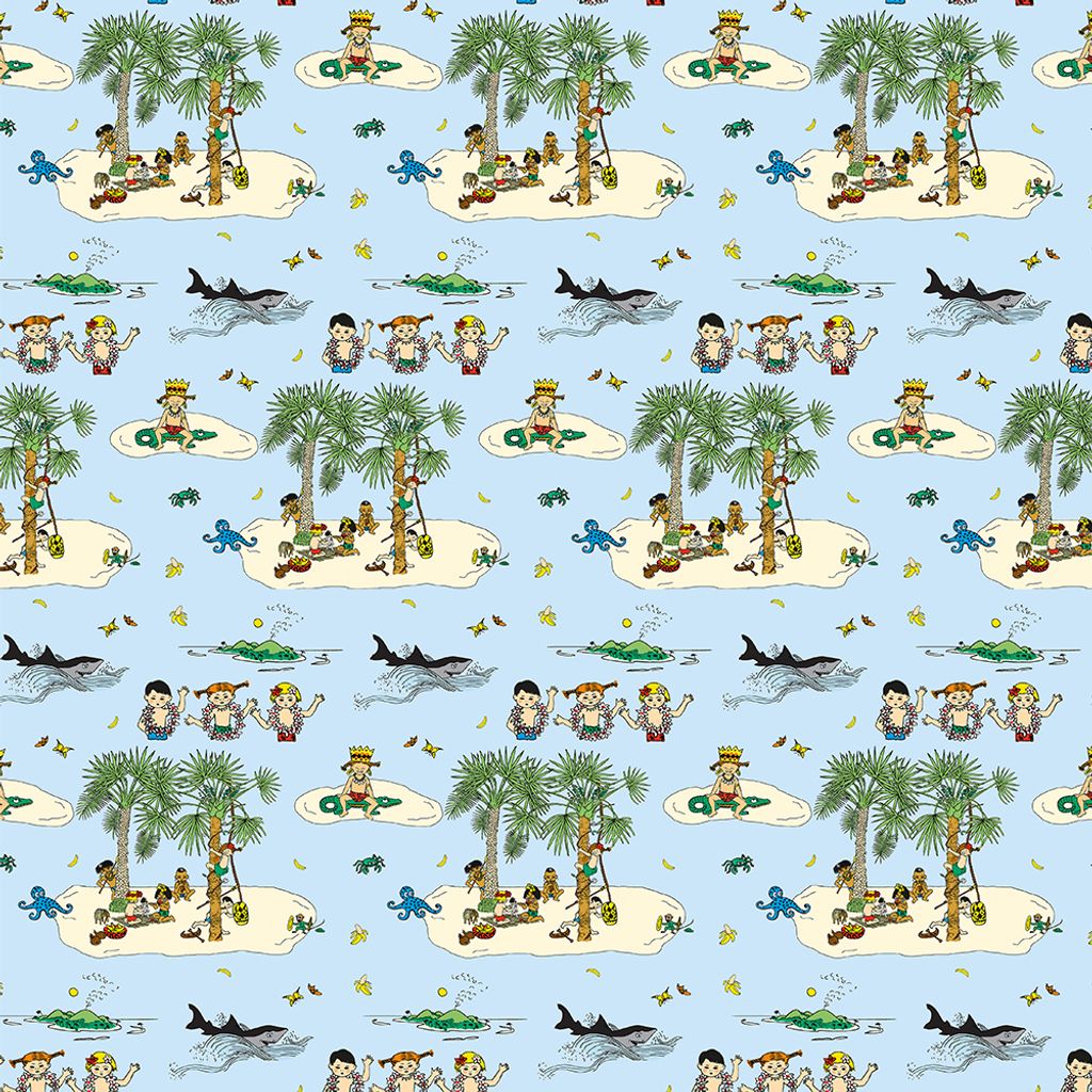 Ett lekfullt bomullstyg inspirerat av Pippi Långstrumps äventyr på Kurrekurreduttön. Det ljusblå tyget är fyllt av livliga scener med Pippi, pirater, palmer och exotiska djur – perfekt för barnrum och kreativa projekt. Bild nummer tre visar hela tygets bredd.