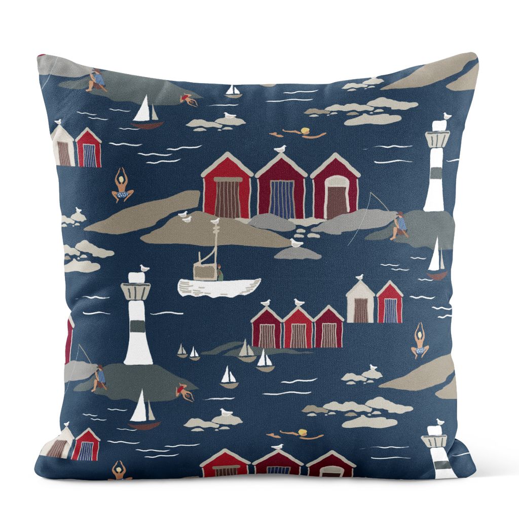 Härligt mönster med båtar, fyrer, sjöbodar, fiskare och badande människor på blå botten. Fodralet är 47x47cm med ett blixtlås i nederkant.