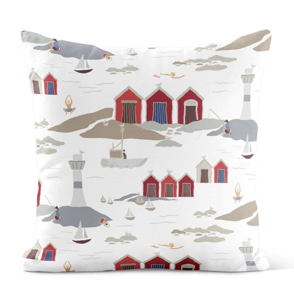 Härligt mönster med båtar, fyrer, sjöbodar, fiskare och badande människor på offwhite botten. Fodralet är 47x47cm med ett blixtlås i nederkant.