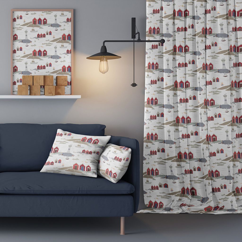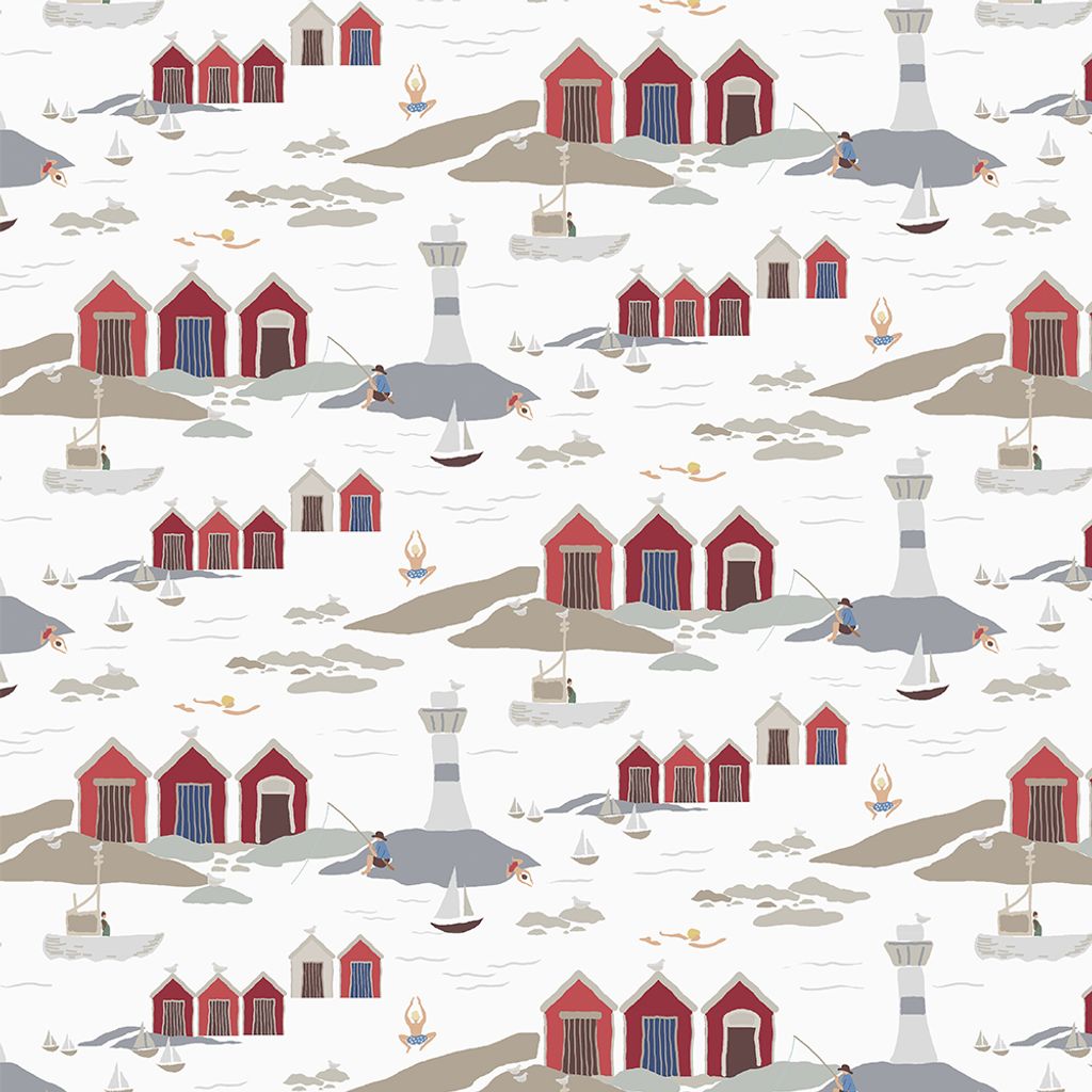 Härligt mönster med båtar, fyrer, sjöbodar, fiskare och badande människor. Gardin och inredningstyg för hemmet och kontoret.