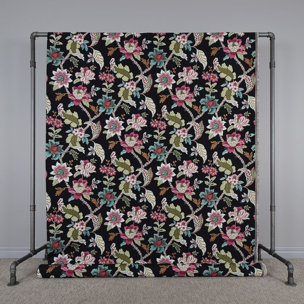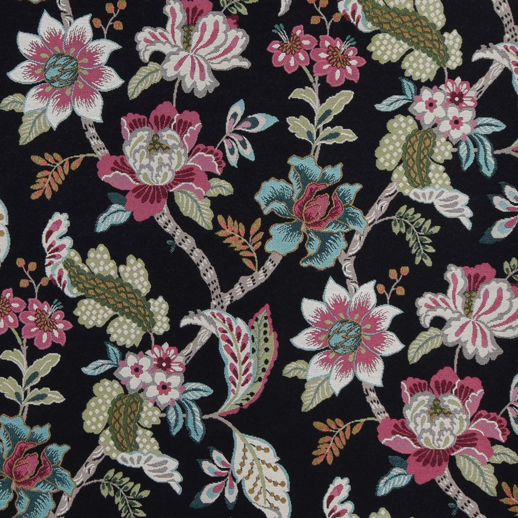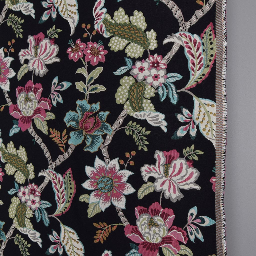 Svart botten med färgglada blommor, gobeläng tyg på metervara.